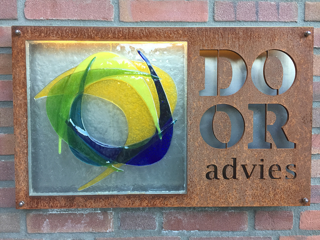 Bij de ingang van ons kantoor hangt een glazen versie van ons logo.